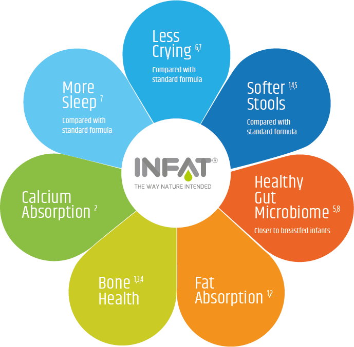 DiscoverInfat ® is an sn-2 fat ingredient that mimics the composition and structure of human milk fat. Multiple human clinical trials conducted with formulas containing fat blends with approximately 20% palmitic acid of which at least 40% was in the sn-2 position, may exert the following benefits to young infants.